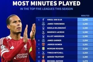 五大联赛出场时间排名:范戴克、安德森等人以2340分钟并列第一