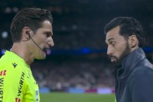 转播方DAZN捕捉到了赛后皇马主帅阿韦洛亚走上前向主裁判表达不满,二人之间的对话。