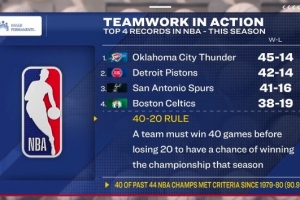 40-20夺冠定律:一支球队必须在输掉20场比赛前赢得40场胜利,才有可能赢得当赛季总冠军。