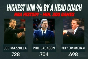 在至少执教300场比赛的主教练中,马祖拉胜率72.8%历史第一!菲尔·杰克逊70.4%第二,比利·坎宁安69.8%第三。
